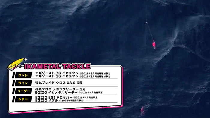 使用するのは2026年4月発売の「EGIZO EGI ドロッパー」「EGIZO メタル」。そして『ワンショットスナップ』でメタルやスッテの交換が簡単にできる「EGIZO イカメタルリーダー」も使用していきます。さらに、ロッドは2026年5月発売予定の新機種が勢ぞろい!「エギゾースト 7G イカメタル」「エギゾースト 1G イカメタル」「NEW ソルパラ イカメタルゲーム」をそれぞれ使っていきます。