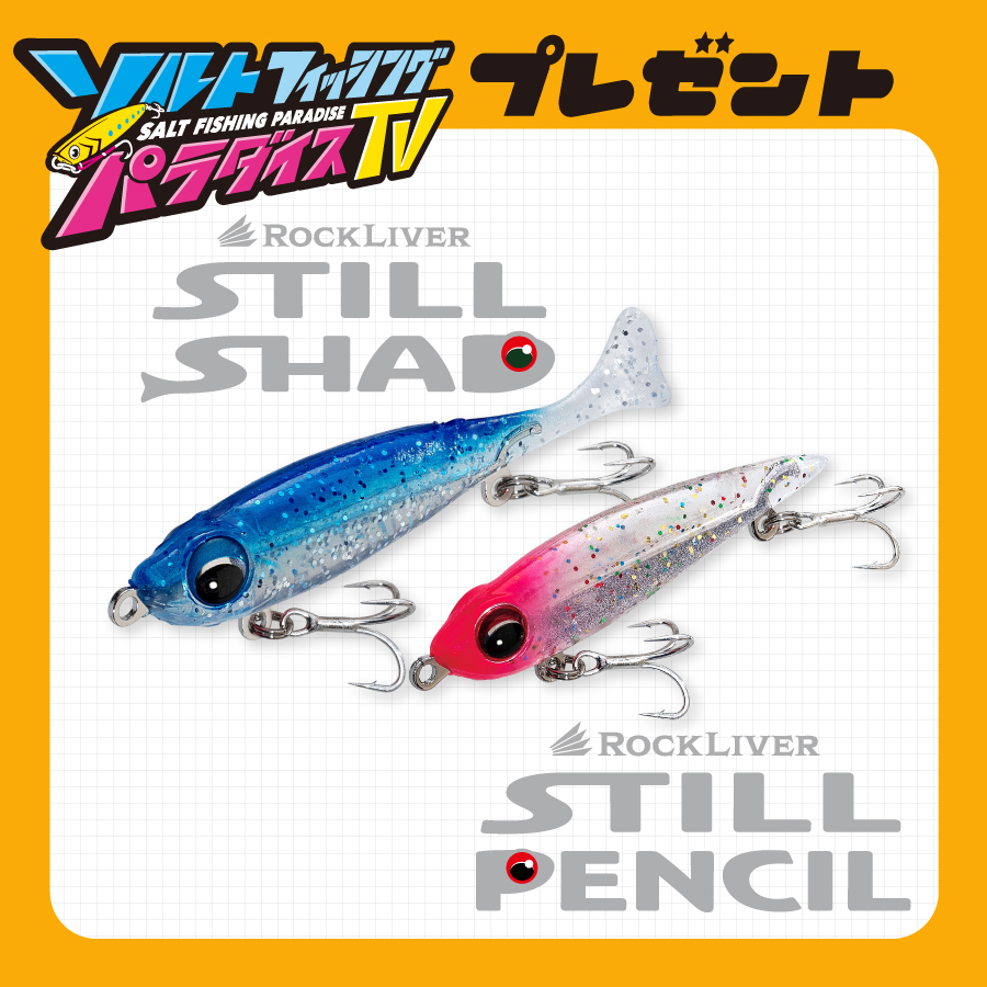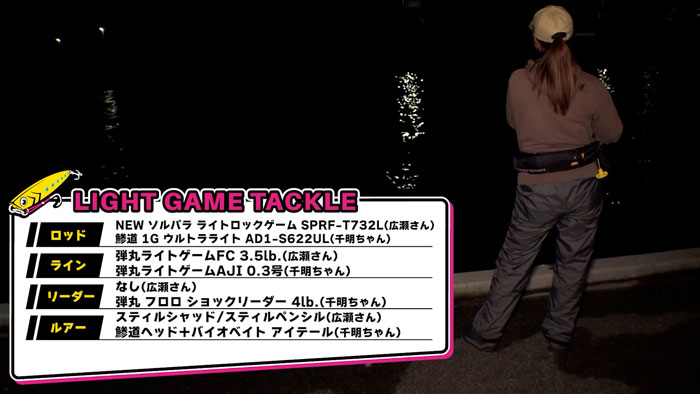 アジ狙いの千明ちゃんは「鯵道ヘッド 豆アジ SS」と「バイオベイト アイテール」の新色。ガシラ、メバル狙いのヒロセマンは新発売のワーム素材のソフトルアー「スティルペンシル」と「スティルシャッド」です。